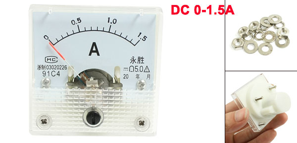 Product Name Analog Ammeter Model 91C4 Accuracy Class 5.0 Measuring Range DC 0-1.5A Meter Face Size(Approx) 4.4 x 4.4 x 0.8cm/1.7" x 1.7" x 0.3"(L*W*T) Thread Diameter 2.5mm/0.09" Overall Depth 3.5cm/1.37" Color Clear, White Net Weight 33g Package Content 1 x Mini Analog Ammeter
