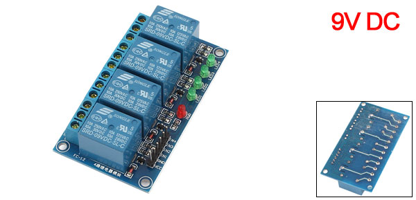 Product Name Relay Module Model SRD-09VDC-SL-C Number of Channels 4 Coil Voltage 9V DC Contact Capacity 10A, AC 250V/125V, DC 30V/28V Size 7.3 x 4 x 2cm/2.9" x 1.6" x 0.78"(L*W*H) Material PCB Color Blue Weight 64g Package 1 x Relay Module - Reviews