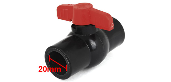 Product Name Ball Valve Ends Type Slip x Slip Slip End Size 1/2" PT x 1/2" PT (20mm x 20mm) Handle Size 6.2 x 2cm / 2.4" x 0.8'' (L*Max.W) Overall Size (Approx.) 7.4 x 6.2cm / 2.9" x 2.4" (L*Max.W) Color Black, Red Material PVC Net Weight 78g Package 1 x Ball Valve - Reviews