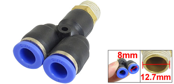 Product Name Pneumatic Quick Fittings Type (Y Shape) Thread Diameter 12.7mm/0.5" Thread Size 1/4" Push in Diameter 8mm/0.31" Material Plastic, Metal Dimension (Approx) 50 x 30 x 14mm/ 0.5" x 0.9" x 0.43"(L*W*T)