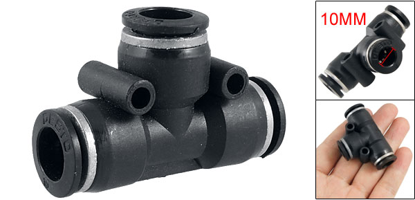 DetailsPneumatic 10mm to 10mm T Joint Push In Quick Fittings Awevu  Product Name Pneumatic Quick Fittings Connector Type 10mm to 10mm ( T-shaped) Material Plastic Dimension (Approx) 5.2 x 3.4 x 1.8cm/ 2" x 1.3" x 0.7" (L*W*T) Main Color Black Weight 20g Package Content 1 x Pneumatic Quick Fittings