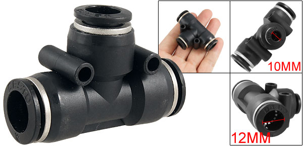 Product Name Pneumatic Quick Fittings Connector Type 10mm to 12mm ( T-shaped) Material Plastic Dimension (Approx) 5.7 x 4 x 2.1cm/ 2.2" x 1.6" x 0.8" (L*W*T) Main Color Black Weight 25g Package Content 1 x Pneumatic Quick Fittings - Reviews
