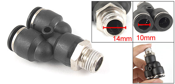 Product Name Pneumatic Quick Fittings Type (Y Shape) Thread Diameter 14mm/0.55" Push in Diameter 10mm/0.394" Material Plastic, Metal Dimension (Approx) 53 x 36 x 17mm/ 2.1" x 1.4" x 0.67"(L*W)