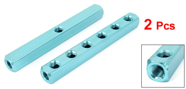 Product Name Manifold Block Threaded Ports Quantity 9 Ports Position 6 Color Teal Blue Material Aluminum Threaded Port Dia 10mm/ 1/4 PT Overall Size 185 x 20 x 20mm / 7.3" x 0.8" x 0.8" (L*W*H) Weight 272g Package 2 x Manifold Block - Reviews