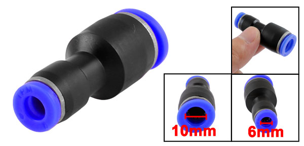 Product Name Quick Fitting Design Straight, 2 Ways Connector Type 6mm to 10mm Material Plastic Size (Approx) 45 x 15mm / 1.8" x 0.6" (L*D) Color Black, Blue Weight 24g Package Content 1 x Pneumatic Quick Fittings - Reviews