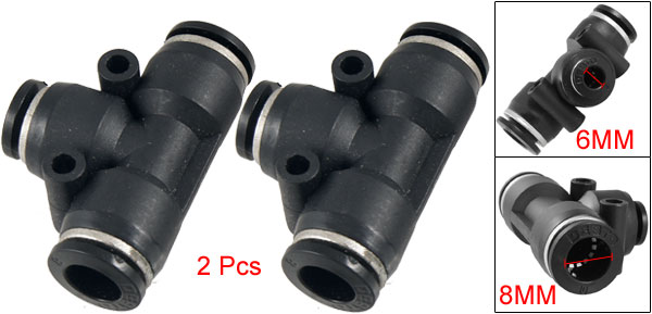 Product Name Pneumatic Quick Fittings Connector Type 6mm to 8mm ( T-shaped) Material Plastic Dimension (Approx) 4.3 x 2.9x 1.5cm/ 1.7" x 1.1" x 0.6" (L*W*T) Main Color Black Weight 23g Package Content 2 x Pneumatic Quick Fittings - Reviews
