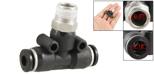 Item Name Quick Fittings Material Alloy & Plastic Color Silver Tone, Black Thread Diameter 9.5mm/ 0.37" Inner Diameter (Black End) 4mm/ 0.16" Overall Size 35 x 30 x 11mm/ 1.4" x 1.2" x 0.4" (L*W*H) Weight 10g Package Content 1 x Quick Fittings - Reviews