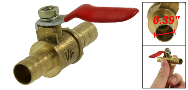Product Name Ball Valve Hole OD 10mm/0.39" Hole Inside Dia. 8mm/0.31'' Level Handle Size 48 x 11mm/1.9'' x 0.43'' (L*W) Overall Size 50 x 16 x 28 mm/1.9'' x 0.6" x 1.1"(L* W*H) Main Color Gold Tone & Red Material Metal, Brass, Plastic Weight 31g Package 1 x Ball Valve - Reviews