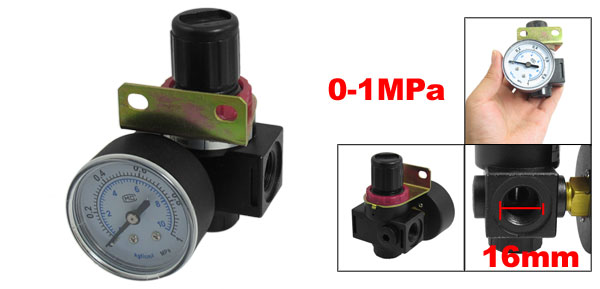 DetailsPneumatic Filter Regulator Air Source Treatment w 0-1MPa Gauge BR-3000  Product Name Pneumatic Regulator Model BR-3000 Material Metal, Plastic Working Medium Air Max. Pressure 9.9Kgf/cm2 Adjustable Pressure Range 0.5-9.0Kgf/cm2 Joint Pipe Thread Diameter 16mm Joint Pipe Size 3/8PT Gauge Connector Thread Diameter 12.6mm Total Size 56 x 40 x 90mm/ 2.2" x 1.6" x 3.5" (L*W*H) Gauge Range 0 - 10kg/cm² / 0 - 1MPa Pressure Gauge Size 52 x 25mm/ 2" x 1" (D * T) Mounting Hole Size 8.4 x 6.6cm/0.3" x 0.25"(L*W) Color Clear, Black Net Weight 217g Package Content 1 x Pneumatic Regulator