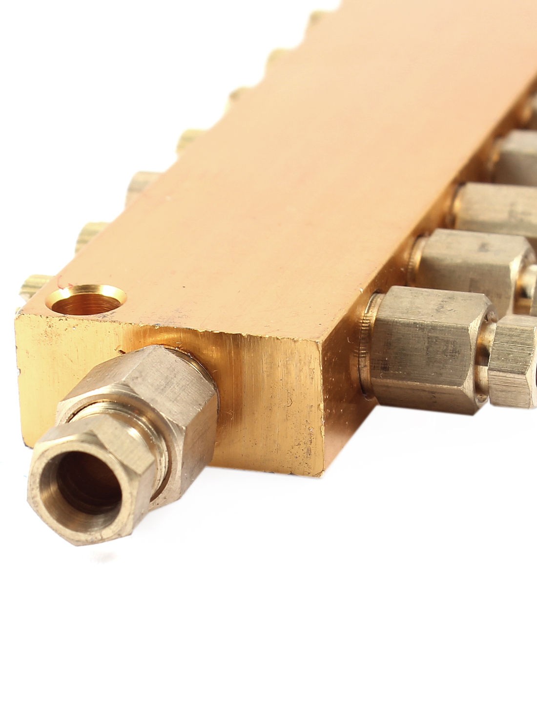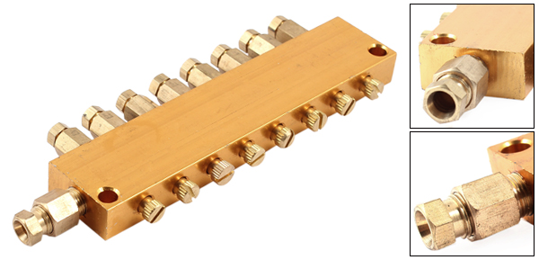 Product Name Adjustable Distributor Type 8 Way Material Brass Color Gold Tone Fit for Tube Inner Dia. 4mm/ 0.16"; 6mm/ 0.24" Mounted Hole Dia. 6mm/ 0.23" Hole Distance 127mm/ 5" (Center to Center) Dimension 160 x 50 x 13mm/ 6.3" x 2" x 0.51"(L*W*H) Net Weight 224g Package Content 1 x Pneumatic Adjustable Distributor - Reviews