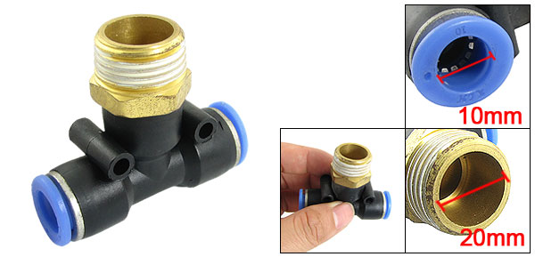 DetailsPneumatic Tubing 10mm Push In Quick Fittings T Joint  Product Name Pneumatic Quick Fittings Type T Connector One Touch Connector 10mm/ 0.39" Thread Connector 20mm/ 0.79" Material Plastic Dimension (Approx) 5.5 x 4.8 x 1.8cm/ 2.2" x 1.89" x 0.71" (L*W*T) Color Black, Blue Weight 41.7g Package Content 1 x Pneumatic Quick Fittings
