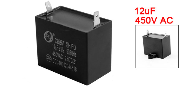 Product Name Motor Run Capacitor Model CBB61 Material Polypropylene Film Rated Capacitance 12uF Tolerance 5% Rated Frequency 50/60 Hz Rated Voltage 450V AC Overall Size 50 x 40 x 27mm/ 2" x 1.6" x 1.1"(L*W*T) Mount Hole Dia 4.5mm/ 0.2" Pin Size 7.5 x 5mm/ 0.3" x 0.2"(L*W) Main Color Black Net Weight 61g Package Content 1 x Motor Run Capacitor - Reviews