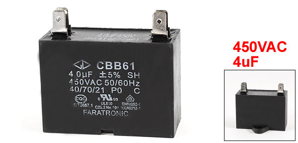 Product Name Motor Capacitor Model CBB61 Dielectric Material Polypropylene Film External Material Plastic Operating Temperature 40/70/21 Rated Capacitance 4uF Tolerance ±5% Rated Frequency 50/60Hz Rated Working Voltage 450VAC Pin Number 4 Mounting Hole Diameter 4.5mm / 0.18" Total Size(Approx) 4.7 x 3.4 x 3.3cm / 1.8" x 1.4" x 1.4" (L*W*H) Main Color Black Weight 44g Package Content 1 x Motor Capacitor - Reviews