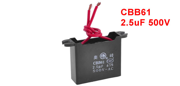 DetailsPolypropylene Film AC Motor Run Capacitor 2.5uF 500V CBB61 Model  Product Name Motor Capacitor Model CBB61 External Material Plastic Dielectric Material Metalized Polypropylene Film Rated Capacitance 2.5uF Tolerance +/-5% Rated Voltage AC 500V Body Size 4.5 x 1.5 x 4cm/ 1.8" x 0.6" x 1.6"(L*W*T) Mount Hole Size 0.6 x 0.4cm/0.24" x 0.16"(L*W) Cable Length 9cm/ 3.5" Net Weight 29g Package Content 1 x Motor Run Capacitor