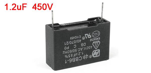 Product Name Motor Capacitor Model CBB61 External Material Plastic Dielectric Material Metalized Polypropylene Film Rated Capacitance 1.2uF Tolerance +/-5% Rated Frequency 50/60Hz Rated Voltage AC 450V Body Size 37 x 23 x 14mm/ 1.5" x 0.9" x 0.6"(L*W*T) Cable Length 1cm/ 0.4" Weight 15g Package Content 1 x Motor Run Capacitor - Reviews