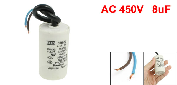 Product Name Motor Capacitor Model CBB60 Material(External) Plastic Rated Capacitance 8uF Tolerance ±5% Rated Frequency 50/60Hz Rated Voltage AC 450V Size 6 x 3.3cm / 2.4" x 1.3"(L * D) Cable Length 15cm / 6" Main Color White Weight 48g Package Content 1 x Motor Capacitor - Reviews