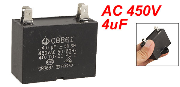 Product Name Motor Capacitor Housing Material Plastic Dielectric Material Polypropylene Film Model CBB61 Capacitance 4uF Tolerance 5% Rated Voltage 450VAC Frequency 50/60Hz Pin Spacing(Approx.) 3.55cm/1.4", 0.8cm/0.31" Overall Size 4.6 x 3.2 x 4.5cm/1.8" x 1.3" x 1.8" (L*W*H) Color Black Weight 45g Package Content 1 x Motor Capacitor - Reviews