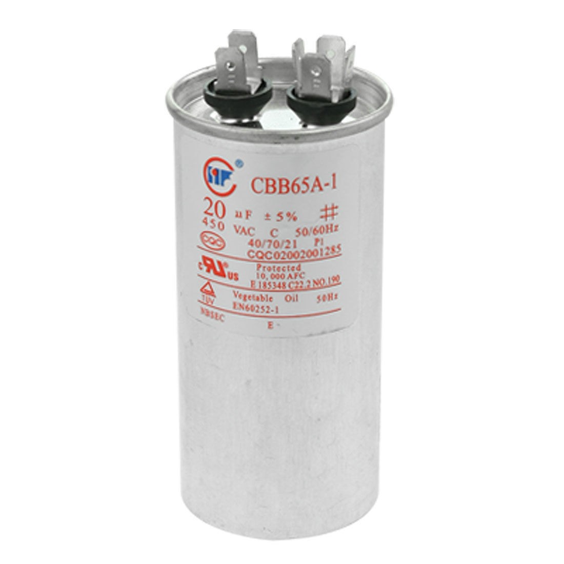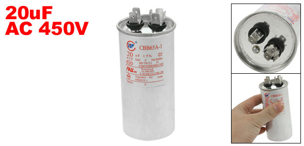 Product Name Motor Capacitor Model No. CBB65A-1 Dielectric Material Metallized Polypropylene Film Housing Material Metal Capacitance 20uF Tolerance ±5% Rated Voltage 450V AC Frequency 50/60Hz Body Dimension 4.5 x 9.5cm/ 1.8" x 3.7" (D * H) Operating Temperature 40/70/21 Color Silver Tone Weight 159g Package Content 1 x Motor Capacitor - Reviews