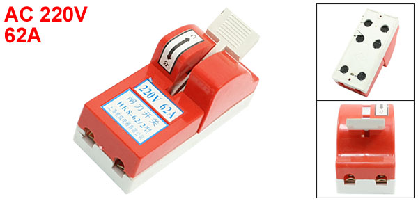 Product Name Disconnect Switch Model No. HK8-62/2 Pole 2 Rating AC 220V 62A Mounting Hole Diameter 4mm/0.16" Mounting Hole Center Distance 142mm/5.6" Overall Size(Approx) 162 x 68 x 85mm/ 6.4" x 2.7" x 3.3" (L*W*H) External Material Plastic Color Red Net Weight 505g Package Content 1 x Disconnect Switch - Reviews