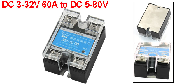 Product Name Solid State Relay Type JGX-60DD Material Metal, Plastic Rated Load Current 60A Input DC 3-32V Output DC 5-80V Mounting Hole Size Small Dia:4.5mm/0.2"