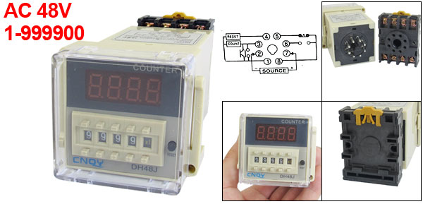 DetailsProgrammable DH48J Digital Counter Relay 1-999900 AC 48V 50/60Hz  Product Name Digital Counter Relay Model DH48J Count Range 1-999900 Power Source AC 48V, 50/60Hz Contact AC 250V 5A ( Resistive Load) Count Speed <300cps Digit Display 4 Mounting Type Panel Mount Marerial Plastic, Electrionic Parts Color Gray Size 11 x 5.8 x 5cm/4.3'' x 2.2'' x 2'' (L*W*H) Net Weight 200g Package Content 1 x Digital Counter Relay w Base