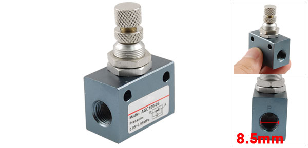 Product Name Flow Control Valve Model ASC100-06 Flow Direction One Way Working Medium Air Port Size PT 1/8"(8.5mm) Working pressure 0.05-0.95Mpa Working temperature -5-60 Celsius Degree Knob Thread Diameter 11.8mm/0.4h6'' Total Size 47 x 32 x 18mm/1.9'' x 1.3'' x 0.7'' (L*W*H) Material Aluminum Alloy Net Weight 45g Package Content 1 x Flow Control Valve - Reviews