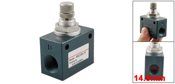 Product Name Flow Control Valve Model ASC300-10 Flow Direction One Way Working Medium Air Thread PT 3/8" (14.8mm) Working pressure 0.05-0.95Mpa Working temperature -5-60 Celsius Degree Knob Thread Diameter 15.9mm/0.63'' Total Size 49 x 27 x 65mm/1.9'' x 1.1'' x 2.6'' (L*W*H) Material Aluminum Alloy Net Weight 143g Package Content 1 x Flow Control Valve - Reviews