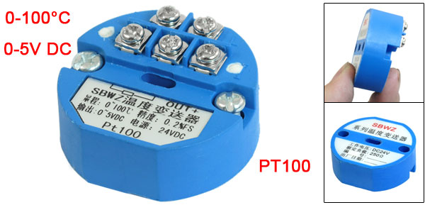 Product Name Temperature Transmitter Model SBWZ Material Plastic Type PT100 Temperature Range 0-100 Celsius Degree Output Voltage 0-5V DC Power Supply 24V DC Rated Load 250 Ohm Precision 0.2% Size 4 x 4.3 x 2cm/1.6" x 1.7" x 0.8"(L*W*T) Color Blue Net Weight 26g Package Content 1 x Temperature Transmitter