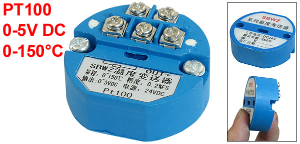 Product Name Temperature Transmitter Model SBWZ Material Plastic Type PT100 Temperature Range 0-150 Celsius Degree Output Voltage 0-5V DC Power Supply 24V DC Rated Load 250 Ohm Precision 0.2% Size 4 x 4.3 x 2cm/1.6" x 1.7" x 0.8"(L*W*T) Color Blue Net Weight 26g Package Content 1 x Temperature Transmitter