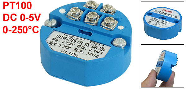 Product Name Temperature Transmitter Model SBWZ Material Plastic Type PT100 Temperature Range 0-250 Celsius Degree Output Voltage 0-5V DC Power Supply 24V DC Rated Load 250 Ohm Precision 0.2% Size 4 x 4.3 x 2cm/1.6" x 1.7" x 0.8"(L*W*T) Color Blue Net Weight 25g Package Content 1 x Temperature Transmitter