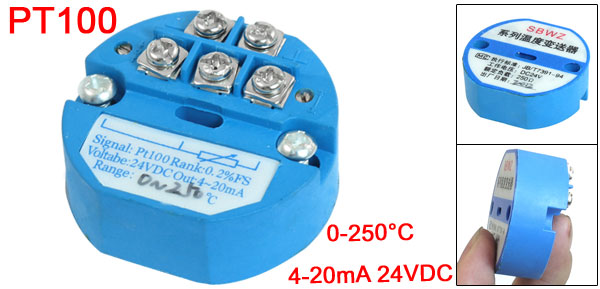 Product Name Temperature Transmitter Model SBWZ Material Plastic Type PT100 Temperature Range 0-250 Celsius Degree Output Current 4-20mA Power Supply 24V DC Rated Load 250 Ohm Precision 0.2% Size 4 x 4.3 x 2cm/1.6" x 1.7" x 0.8"(L*W*T) Color Blue Net Weight 39g Package Content 1 x Temperature Transmitter