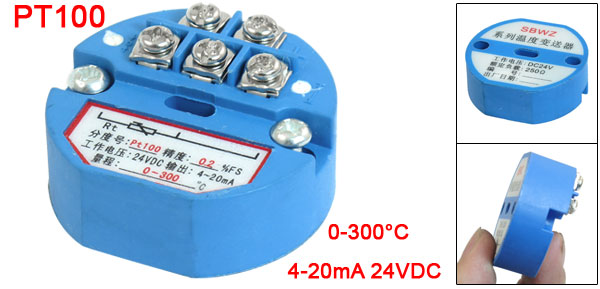 Product Name Temperature Transmitter Model SBWZ Material Plastic Type PT100 Temperature Range 0-300 Celsius Degree Output 4-20mA Power Supply 24V DC Rated Load 250 Ohm Precision 0.2% Size 4 x 4.3 x 2cm/1.6" x 1.7" x 0.8"(L*W*T) Color Blue Net Weight 25g Package Content 1 x Temperature Transmitter