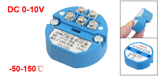 Product Name Temperature Transmitter Model SBWZ Material Plastic Type PT100 Temperature Range -50-150 Celsius Degree Output Voltage 0-10V DC Power Supply 24V DC Rated Load 250 Ohm Precision 0.2% Size 4 x 4.3 x 2cm/1.6" x 1.7" x 0.8"(L*W*T) Color Blue Net Weight 26g Package Content 1 x Temperature Transmitter