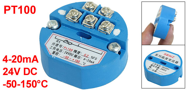 Product Name Temperature Transmitter Model SBWZ Material Plastic Type PT100 Temperature Range -50-150 Celsius Degree Output 4-20mA Power Supply 24V DC Rated Load 250 Ohm Precision 0.2% Size 4 x 4.3 x 2cm/1.6" x 1.7" x 0.8"(L*W*T) Color Blue Net Weight 25g Package Content 1 x Temperature Transmitter
