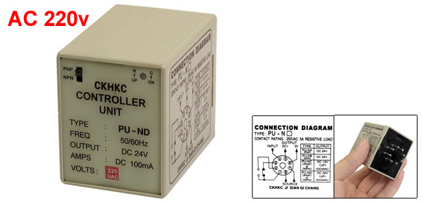 Product Name Controller Unit Model PU-ND Action Type SPDT Output Voltage DC 24V Input Voltage AC 220v Frequency 50/60Hz Amps DC 100mA Contact Rating AC 250V 5A Resistive Load Number of Terminals 8 Pins Indicator Color Red(UP), Green(ON) Color Gray Material (External) Plastic, Metal Body Size 4 x 5 x 5.7cm/ 1.6'' x 2'' x 2.2'' (L*W*T) Net Weight 134g Package Content 1 x Controller Unit - Reviews