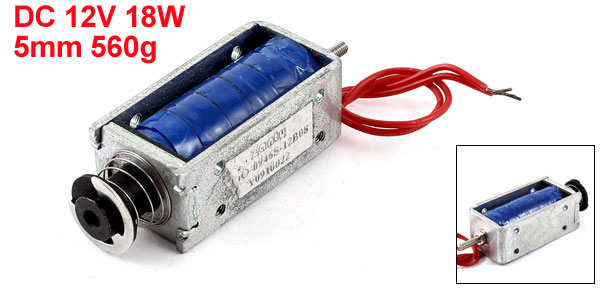 Product Name DC Solenoid Electromagnet Rated Voltage DC 12V Current 1.5A Power 18W Type Pull Stroke & Force 5mm, 560g Plunger Dia. 9mm/0.35" Total Size 53 x 23 x 19mm/2.9" x 1.14" x 0.94"(L*W*H) Cable Length 11cm/0.43" Material Metal, Electronic Parts Net Weight 109g Package Content 1 x DC Solenoid Electromagnet - Reviews