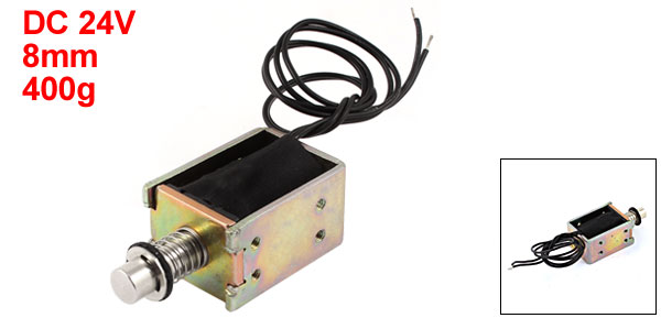 Product Name DC Solenoid Electromagnet Rated Voltage DC 24V Current 1.84A Power 44.3W Type Pull Stroke & Force 8mm, 400g Plunger Dia. 8mm/0.3" Total Size 59 x 27 x 21mm/2.3" x 1.06" x 0.83"(L*W*H) Cable Length 29cm/1.14" Material Metal, Electronic Parts Net Weight 100g Package Content 1 x DC Solenoid Electromagnet - Reviews