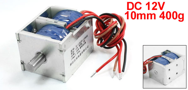 Product Name Solenoid Electromagnet Type Pull Rated Voltage DC 12V Current 2A Power 24W Electrified Rate 15% Stroke & Force 10mm 400g Body Size(Approx) 43 x 34 x 30mm / 1.7" x 1.3" x 1.2" (L*W*H) Plunger Diameter 7mm/ 0.28" Cable Length(Approx) 25cm / 9.8" (Each) External Material Metal, Electronic Parts Color As Picture Shown Weight 211g Package Content 1 x Solenoid Electromagnet - Reviews
