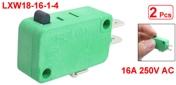 Product Name Micro Switch Model No. LXW18-16-1-4 Actuator Type Push Button Rated Load 16A 250V AC Switch Body Size(Each) 2.8 x 1.6 x 1cm / 1.1" x 0.6" x 0.4" (L*W*H) Holes Dia. 0.3cm / 0.11" (Approx) Button Size 0.4 x 0.2cm/0.15" x 0.08"(W*H) Material Plastic & Metal Main Color Green Net Weight 15g Package Content 2 x Micro Switch - Reviews