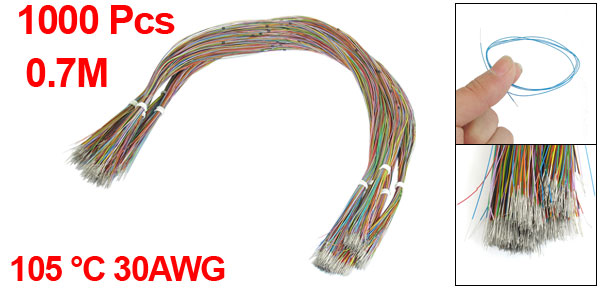 Product Name Wrapping Wire Model P/N B-30-1000 Type 30AWG Wire Size 0.5 x 700mm / 0.02" x 27.5"(OD*L) Cable Quantity 1000 Pcs Temperature Rating 105 C Material Plastic, PVC, Tin Plated Copper External Color Colorful Weight 295g Package 1 x Wrapping Wire - Reviews