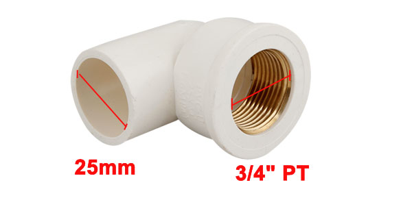 Product Name Elbow Connector Design 90 Degree Ends Slip x Female Thread Slip End Inner Dia. 25mm / 1" Female Thread Dia. 24.11mm / 3/4" PT Overall Size (Approx.) 5 x 4.8 x 4.2cm / 2" x 1.9" x 1.7" (L*W*D) Material PVC-U, Brass Color Beige, Brass Tone Net Weight 62g Package Content 1 x Elbow Connector - Reviews