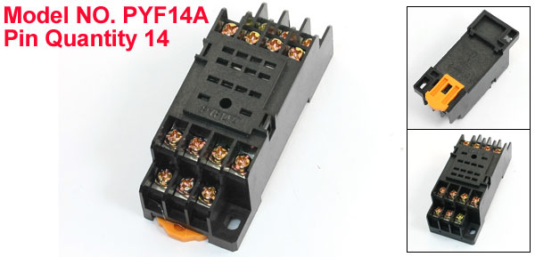 Product Name PYF14A Relay Base Model NO. PYF14A Pin Quantity 14 Total Size (Approx.) 7.5 x 3 x 2.8cm / 3" x 1.2" x 1.1" (L * W *T) Fit Mounting DIN Rail Type 35mm/1.4" Installing Hole Size 4mm/0.16" Installing Hole Spacing 6cm/2.4" Material Plastic, Metal Main Color Black Weight 45g Package Content 1 x PYF14A Relay Base - Reviews