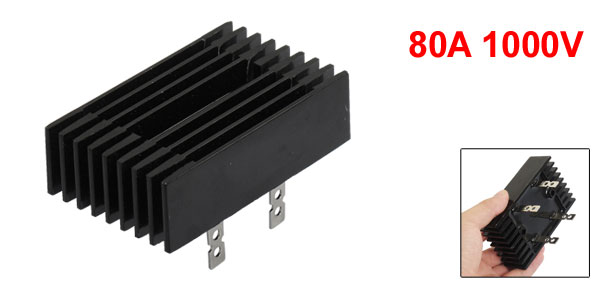Product Name Bridge Rectifier Model QL80A1000V Output Current(DC) 80A Repetitive Peak Reverse Voltage(AC) 1000V Number of Pins 4 Pin Size 25 x 8mm/ 1" x 0.3"(L*W) Fixing Holes Diameter 5.5mm/ 0.22" Fixing Holes Spacing 55mm/ 2.2" Main Body Size 97 x 60 x 29mm/ 3.8" x 2.4" x 1.1" (L*W*T) Material Metal, Plastic Color As Picture Shown Net Weight 236g Package Content 1 x Bridge Rectifier - Reviews