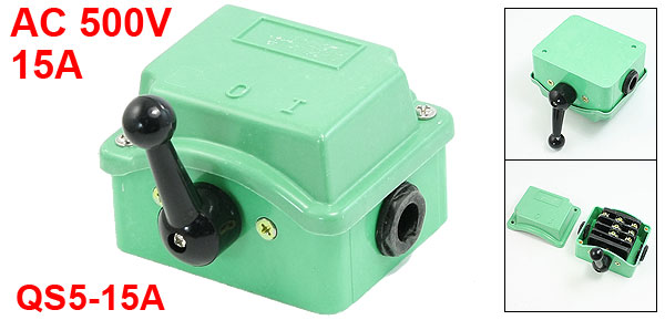 Product Name Reversing Drum Switch Model No. QS5-15A Rated Voltage AC 500V Rated Current 15A Motor Control Rated Capacity 220V/2.5KW, 380V/10KW Applications Forward, Reverse Main Body Size 8 x 7 x 6 cm / 3.1" x 2.7" x 2.4" (L*W*H) Main Material Plastic, Metal, Electric Parts Color Green, Black Net Weight 284g Package Content 1 x Reversing Drum Switch