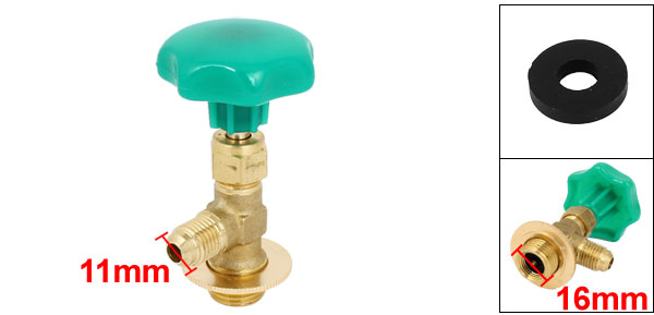 Product Name Can Tap Valve Model No. CM-338 Fit For R12 Refrigerant Color Brass Tone,Green Material Brass, Plastic Outlet Hole Diameter 5mm/0.2" Side Thread Diameter 11mm/ 0.43" Bottom Thread Diameter Inner: 11mm/ 0.43"