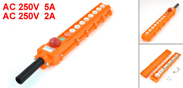 AC 250V, 2AOverall Size(Approx.) 40 x 3.2 x 2.2cm / 15.8" x 1.3" x 0.9"(L*W*T) Jointing Sleeve Size 11.6 x 2.3cm / 4.6" x 0.9"(L*Dia.) Housing Material ABS Color Orange Net Weight 538g Package Content 1 x Hoist Pushbutton Switch