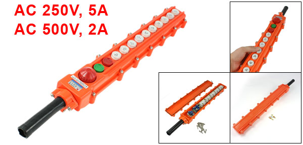 AC 500V, 2AOverall Size(Approx.) 46 x 7 x 5cm / 18.1" x 2.8" x 2"(L*W*T) Jointing Sleeve Size 12 x 2.9cm / 4.7" x 1.1"(L*Dia.) Housing Material ABS Color Orange Red Net Weight 727g Package Content 1 x Hoist Pushbutton Switch