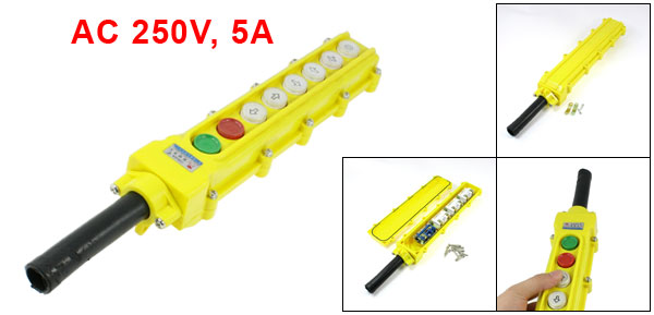 Product Name Hoist Pushbutton Switch Model No. COB-63A Feature Rainproof Type Push Buttons On, Off, Up, Down, East, West, South, North Rated Voltage & Current AC 250V, 5A Overall Size(Approx.) 31 x 6 x 5cm / 12.2" x 2.4" x 2"(L*W*T) Jointing Sleeve Size 12 x 2.9cm / 4.7" x 1.1"(L*Dia.) Housing Material ABS Color Yellow Net Weight 539g Package Content 1 x Hoist Pushbutton Switch