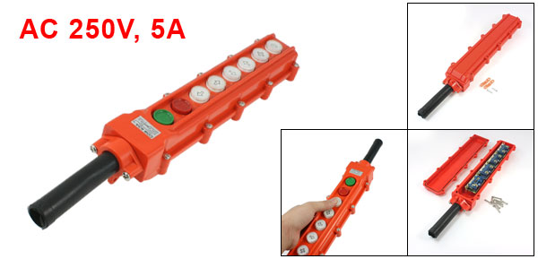 Product Name Hoist Pushbutton Switch Model No. COB-63A Feature Rainproof Type Push Buttons On, Off, Up, Down, East, West, South, North Rated Voltage & Current AC 250V, 5A Overall Size(Approx.) 31 x 6 x 5cm / 12.2" x 2.4" x 2"(L*W*T) Jointing Sleeve Size 12 x 2.9cm / 4.7" x 1.1"(L*Dia.) Housing Material ABS Color Orange Red Net Weight 514g Package Content 1 x Hoist Pushbutton Switch