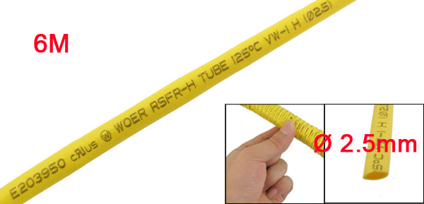 Ratio 2:1 2.5mm Dia Yellow Polyolefin Heat Shrinkable Tube 6M 19.7ft